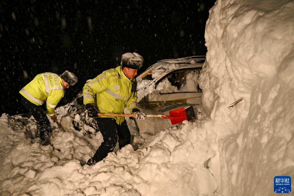 馬詠琪(右)和同事在救援現場(chǎng)清除積雪(1月8日攝)。新華社記者 胡虎虎 攝