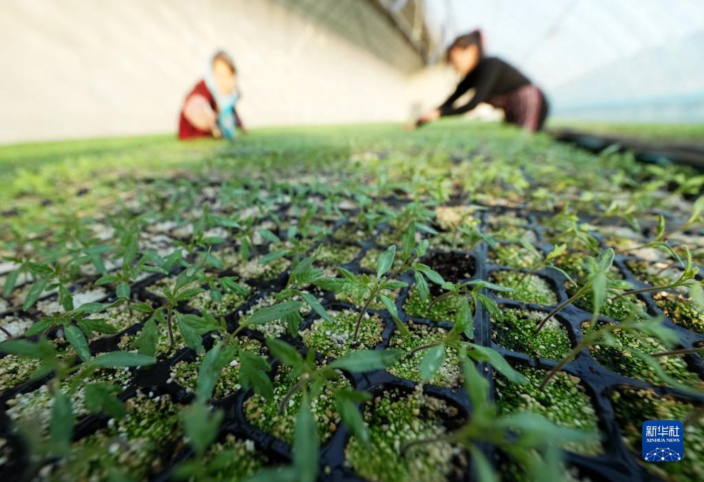 1月10日,河北省唐山市豐南區大新莊鎮一家育苗基地的工人在管護西紅柿秧苗。