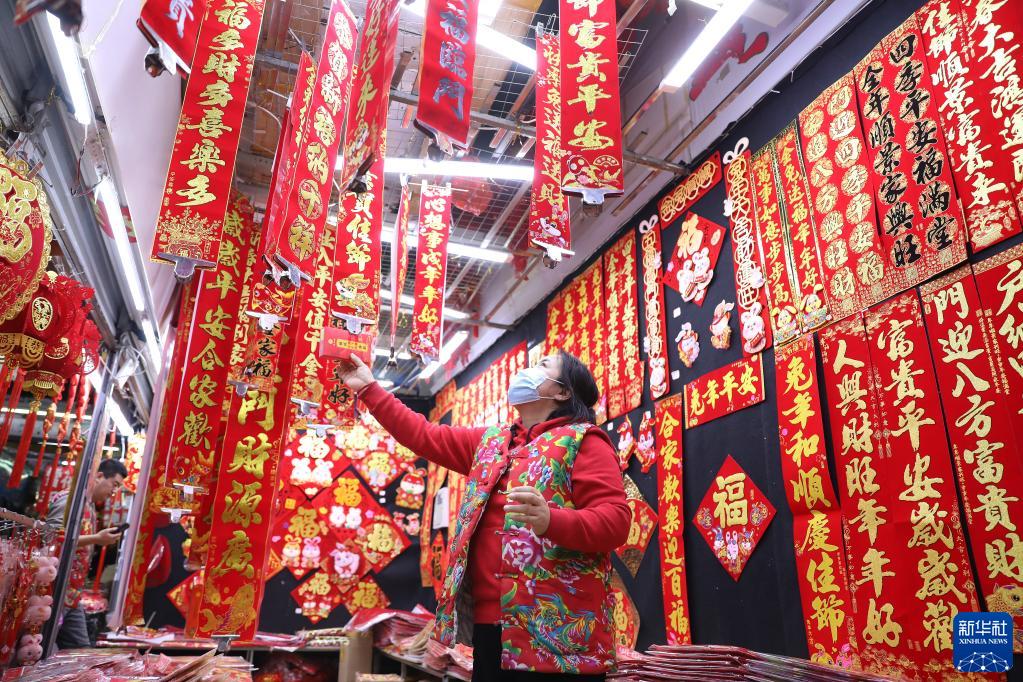 1月11日,遼寧沈陽(yáng)五愛(ài)國際小商品城的一位店主在整理對聯(lián)。