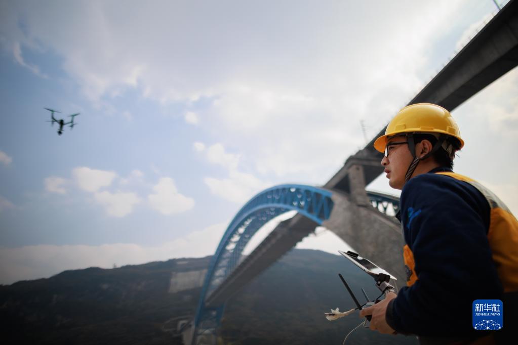 1月10日,貴陽(yáng)高鐵工務(wù)段工作人員利用無(wú)人機對大橋進(jìn)行檢查。