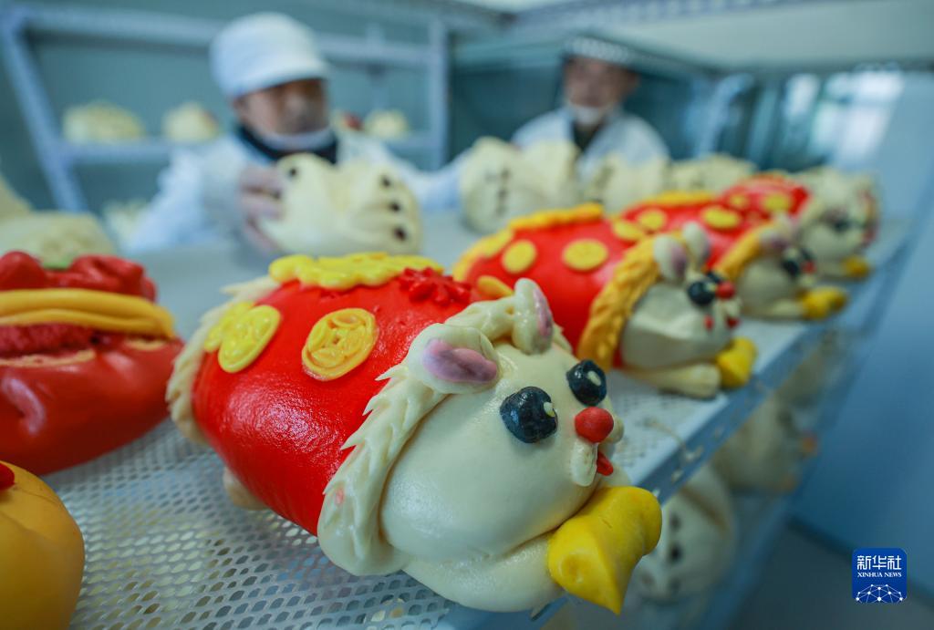 1月11日,在榮成市崖頭街道榮安社區一處花餑餑制作坊,工作人員在擺放蒸制好的“兔頭”花餑餑和棗餑餑。