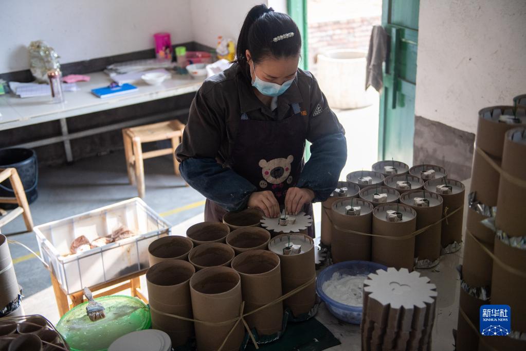 1月11日,在瀏陽(yáng)市大瑤鎮一花炮車(chē)間,工作人員在制作花炮。