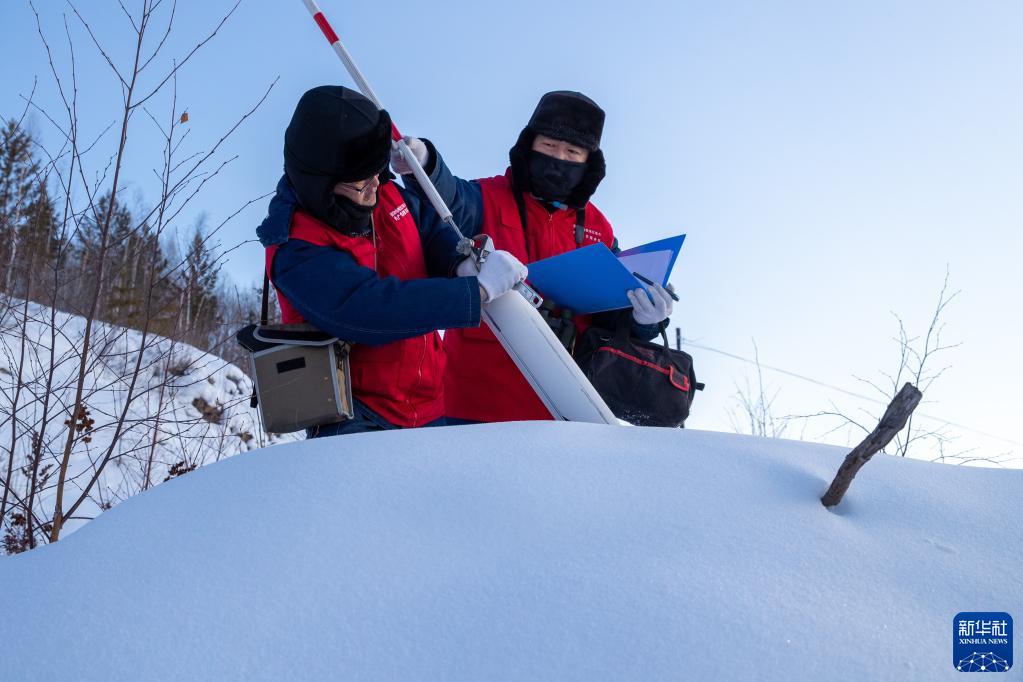 1月9日,在漠河市北極村,線(xiàn)路設備運維人員代洪濱(左)和馬國軍在維修供電設備。新華社記者 張濤 攝