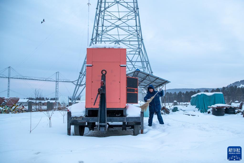 1月11日,線(xiàn)路設備運維人員馬國軍在北極村供電所內清理積雪。新華社記者 張濤 攝