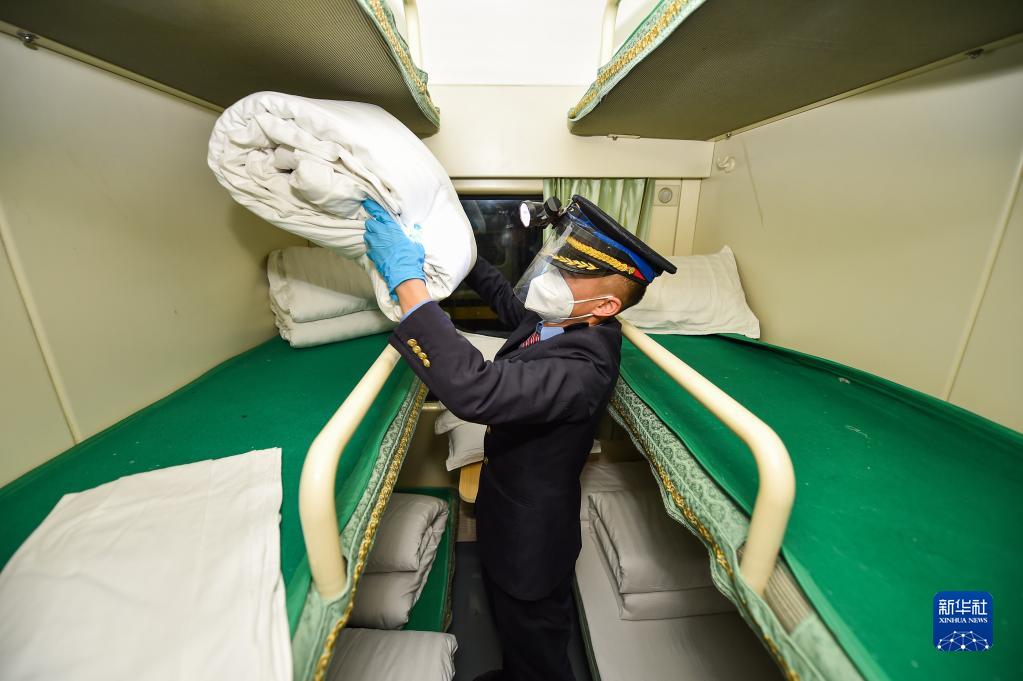 1月10日,在呼和浩特客運段整備旅服車(chē)間,列車(chē)員為列車(chē)換上干凈臥具。