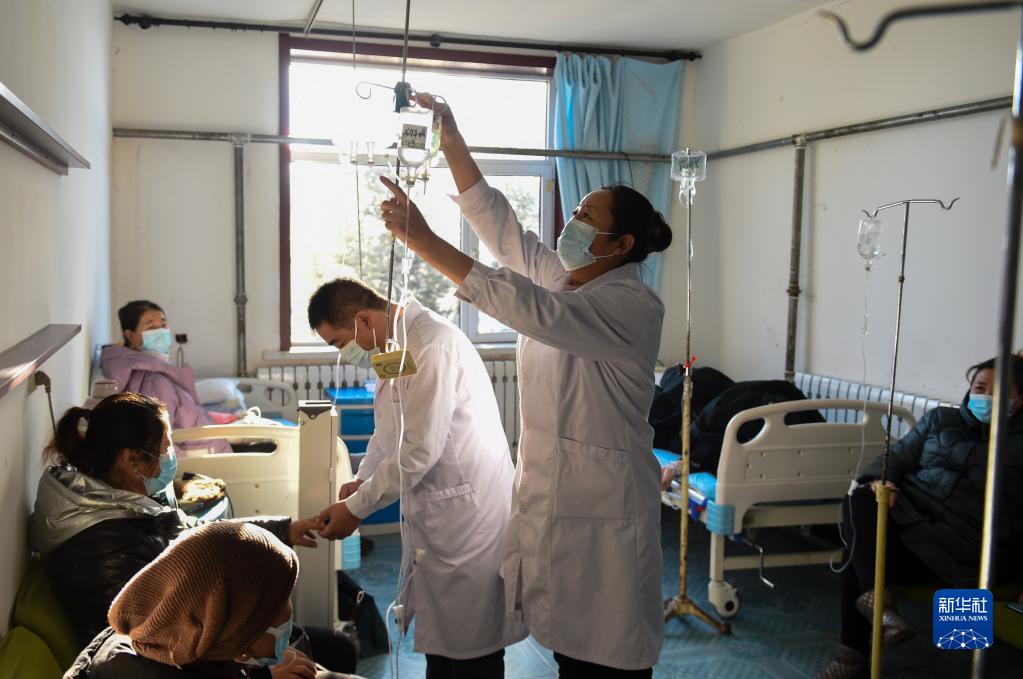 1月7日,陳麗華和丈夫姚春明在巴彥高勒衛生院的診療室內為前來(lái)就診的牧民輸液。