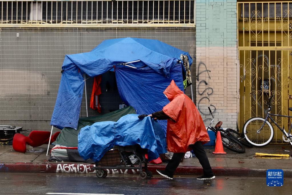1月10日,一名無(wú)家可歸者冒雨走在美國洛杉磯市中心第六街街頭。該區域是加利福尼亞州洛杉磯地區無(wú)家可歸者最集中的區域之一。
