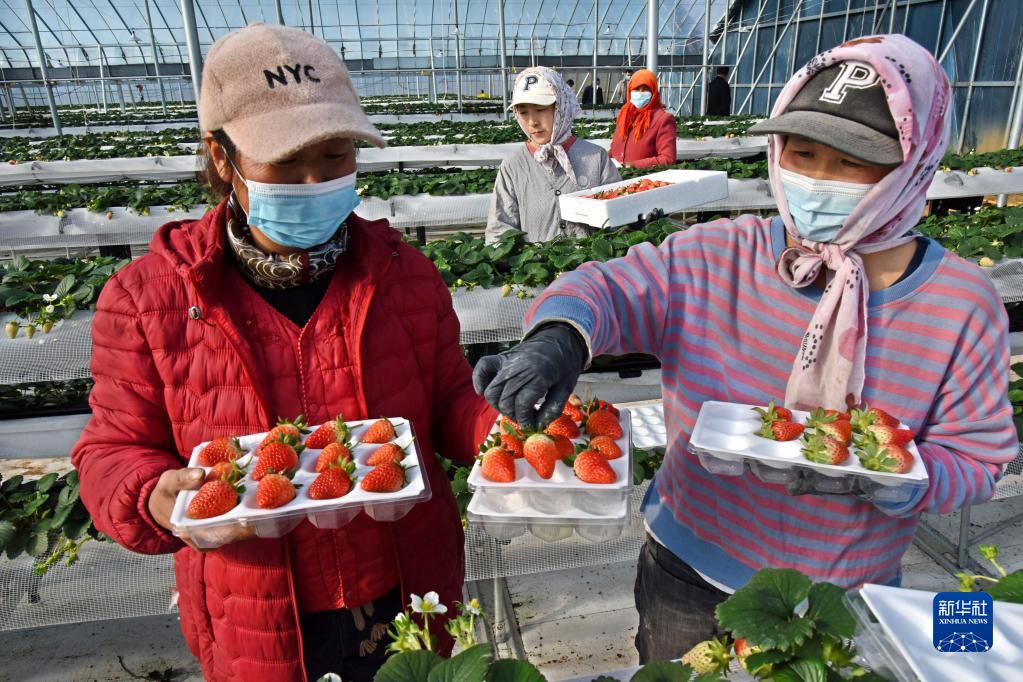 1月11日,山東省平度市舊店鎮東店子村村民在智能溫室采摘草莓。