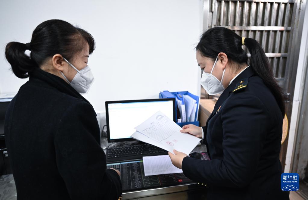 在??诘幕浐hF路輪渡南港碼頭售票處,伍琳(右)和同事交接業(yè)務(wù)(1月9日攝)。
