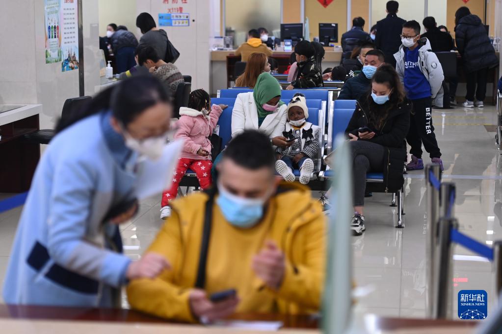 1月11日,外國客商在義烏市公安局出入境管理局辦事大廳辦理業(yè)務(wù)。