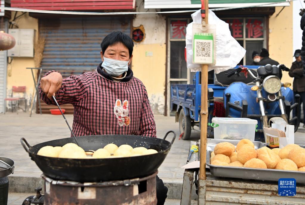 1月12日,一名攤主在金井鄉的年集上炸芝麻球。