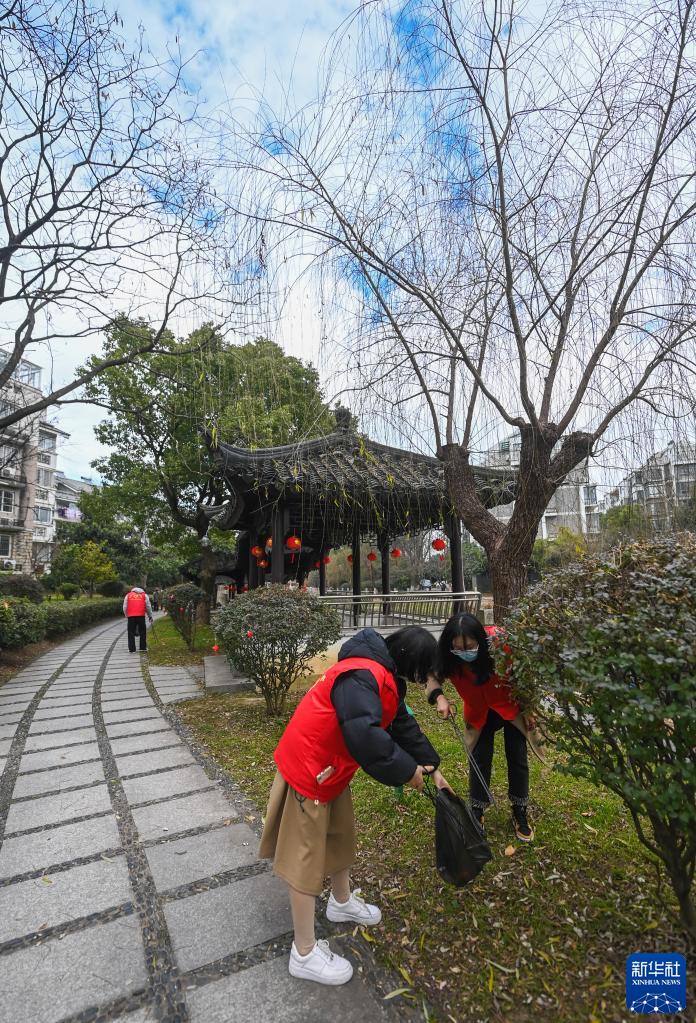 1月12日,在飛英街道河畔居小區內,志愿者在清理垃圾、打掃衛生。