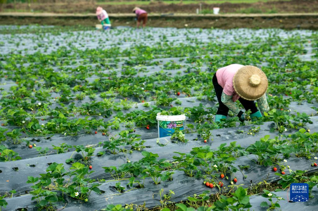 近日,在海南省瓊海市,草莓陸續成熟。農民搶抓農時(shí)忙采摘,以供應節日市場(chǎng)。