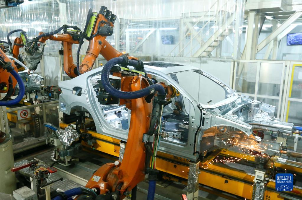 1月12日,在山東省青島市即墨區一家汽車(chē)制造企業(yè)焊裝車(chē)間,機器人進(jìn)行焊接作業(yè)。