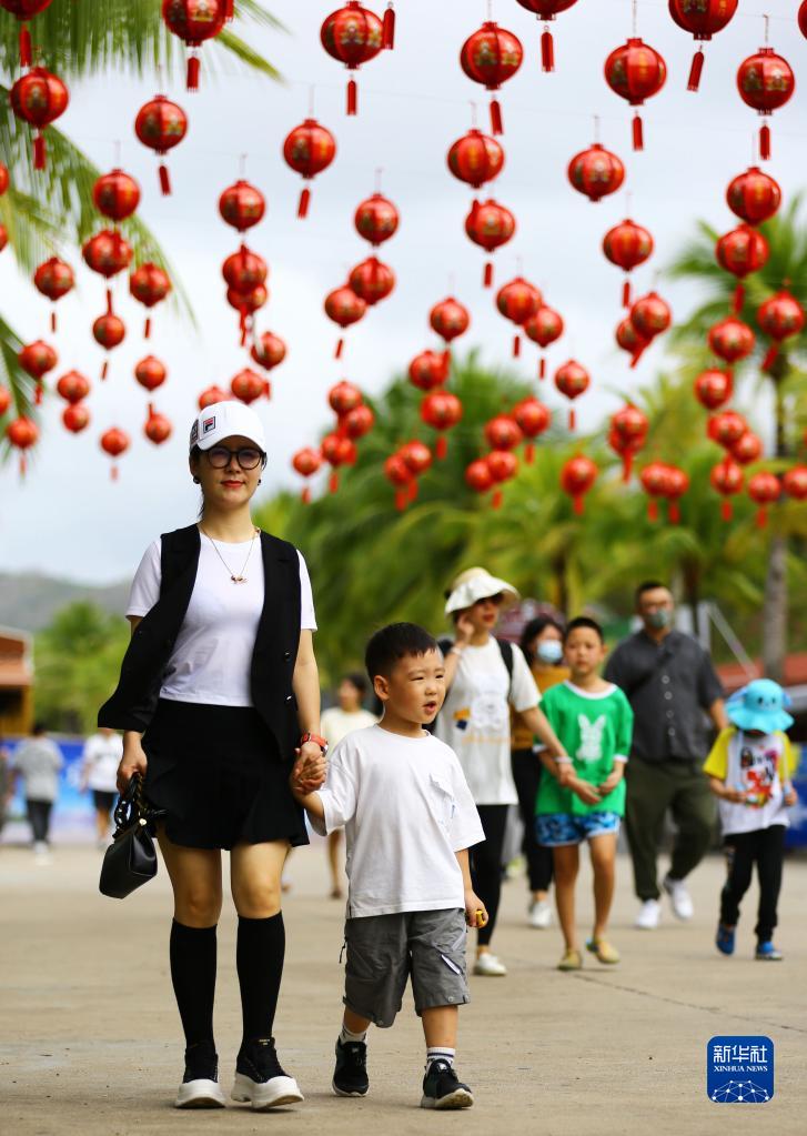 1月12日,家長(cháng)帶著(zhù)孩子在海南省三亞南山文化旅游區游覽。