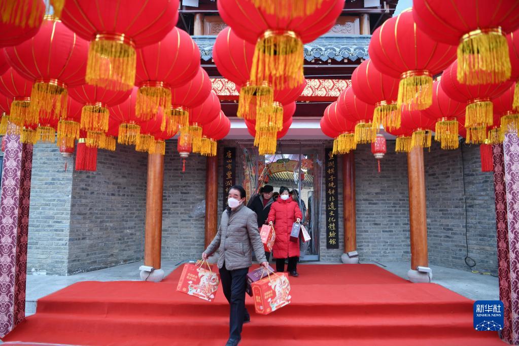 1月12日,顧客提著(zhù)購買(mǎi)的商品走出“非遺”年貨節現場(chǎng)。