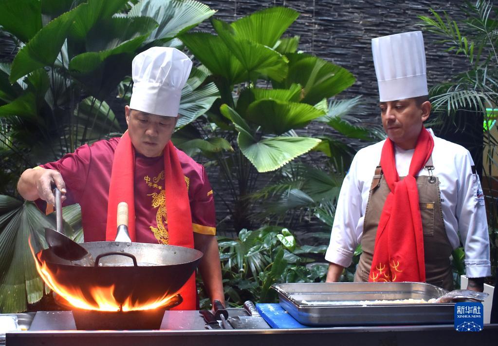 1月12日,在古巴首都哈瓦那,一名中國廚師(左)在2023年古巴國際美食節上展示廚藝。