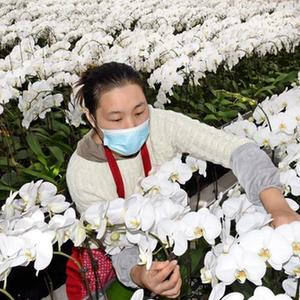 近日,山東省平度市舊店鎮花卉種植基地50萬(wàn)株蝴蝶蘭進(jìn)入盛花期,花工們忙碌著(zhù)整理打包花卉,供應節日市場(chǎng)。