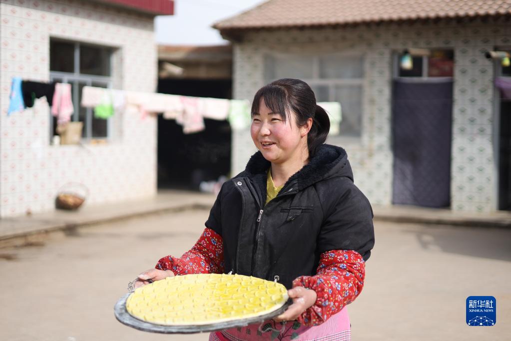 1月11日,元古堆村的村民端著(zhù)面餅準備制作烤饃。