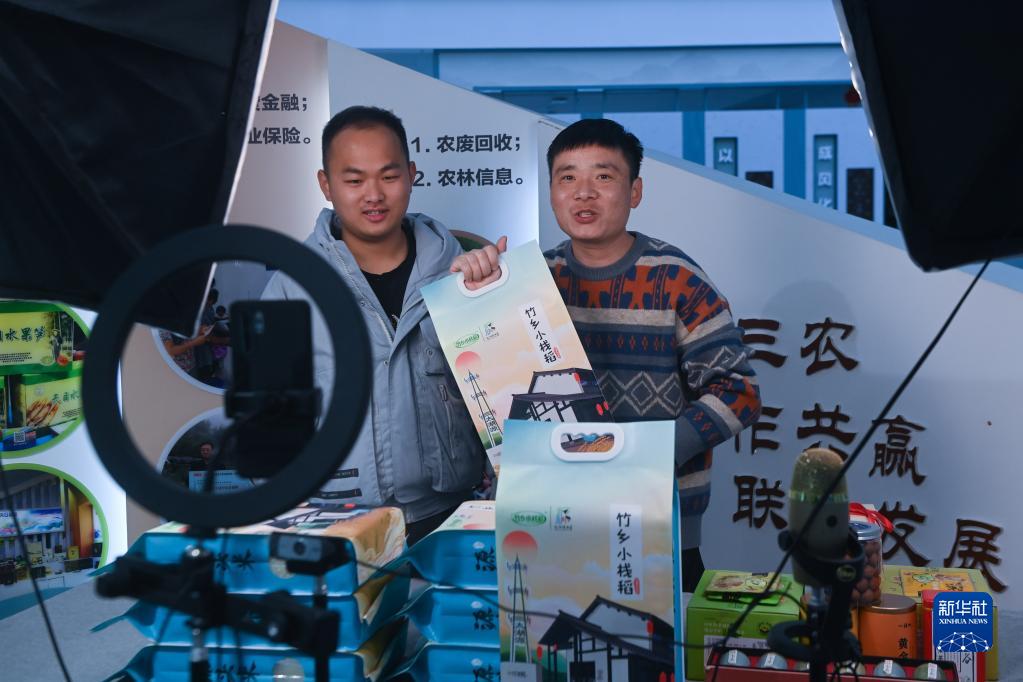 1月13日,在太湖源鎮黨群服務(wù)中心的直播間,吳旭東(右)和創(chuàng )業(yè)伙伴吳斌一起吆喝自己種植的大米。