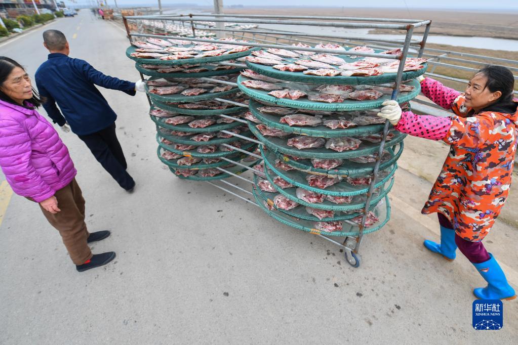 在岳陽(yáng)市君山區錢(qián)糧湖鎮六門(mén)閘社區生態(tài)漁村,居民在運送晾曬好的魚(yú)干(1月12日攝)。