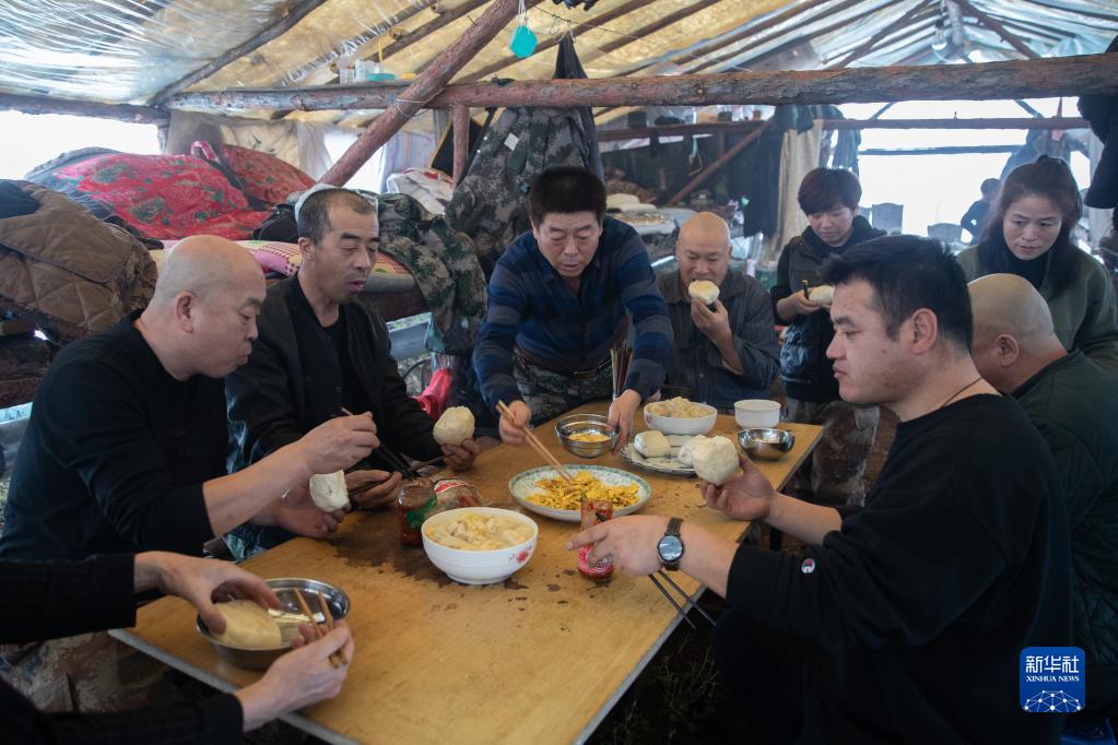 1月11日,在漠河林場(chǎng)管護區作業(yè)點(diǎn)臨時(shí)帳篷內,森林撫育工人用餐。