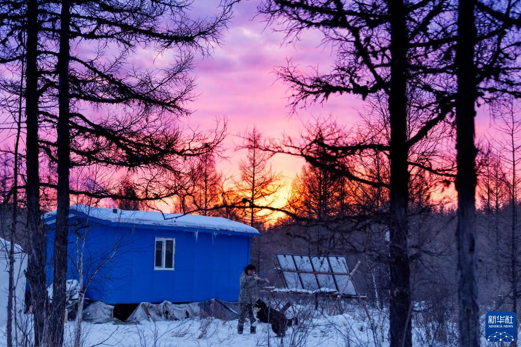 1月12日清晨,覺(jué)樂(lè )在馴鹿點(diǎn)的“房車(chē)”前呼喚自己養的兩條狗,準備出去尋找鹿群。新華社記者 費茂華 攝