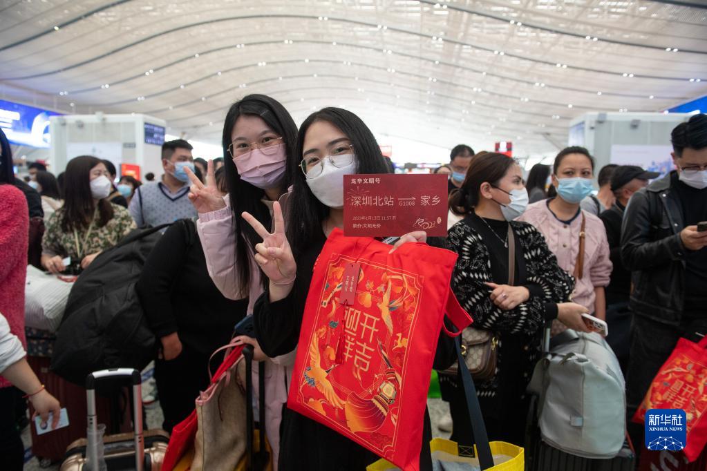 當日,G1008次愛(ài)心專(zhuān)列搭載著(zhù)500多名長(cháng)期在深圳工作的文明實(shí)踐志愿者從深圳北站駛往武漢。G1008次列車(chē)是深圳鐵路部門(mén)今年春運開(kāi)出的第6趟愛(ài)心專(zhuān)列,暖心助力深圳地區的文明實(shí)踐志愿者和城市奮斗者及家人順利回家過(guò)年。新華社記者 毛思倩 攝