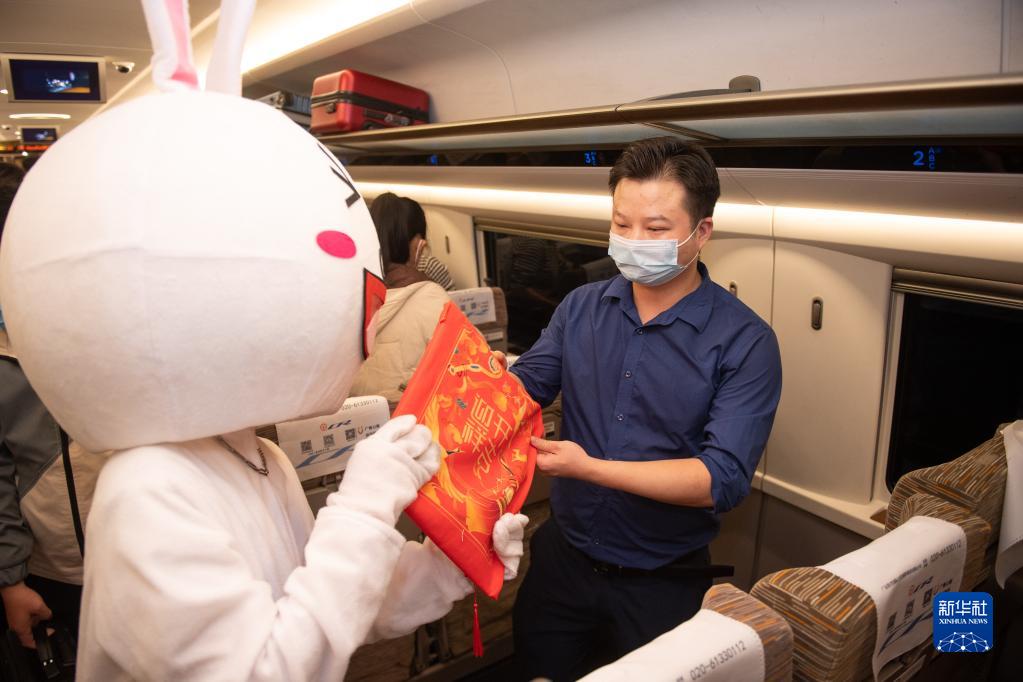 當日,G1008次愛(ài)心專(zhuān)列搭載著(zhù)500多名長(cháng)期在深圳工作的文明實(shí)踐志愿者從深圳北站駛往武漢。G1008次列車(chē)是深圳鐵路部門(mén)今年春運開(kāi)出的第6趟愛(ài)心專(zhuān)列,暖心助力深圳地區的文明實(shí)踐志愿者和城市奮斗者及家人順利回家過(guò)年。新華社記者 毛思倩 攝
