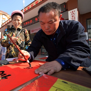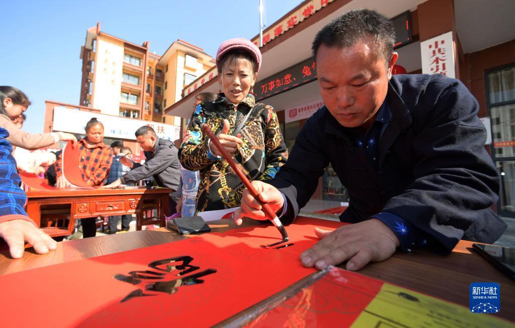 1月13日,書(shū)法愛(ài)好者(右一)在羅甸縣木引鎮康夢(mèng)家園為群眾書(shū)寫(xiě)春聯(lián)。