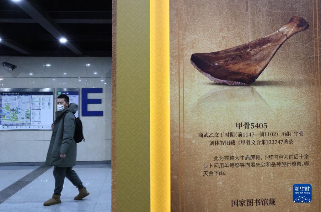 這是國家圖書(shū)館地鐵站內展出的殷墟甲骨展板(1月13日攝)。國家圖書(shū)館結合展覽主題,與京港地鐵聯(lián)合主辦的M地鐵·圖書(shū)館推出“探尋文明的印跡”活動(dòng)。在國家圖書(shū)館地鐵站內的展區,可以看到殷墟甲骨、居延漢簡(jiǎn)、敦煌遺書(shū)、明清檔案四個(gè)主題的文物仿制品。