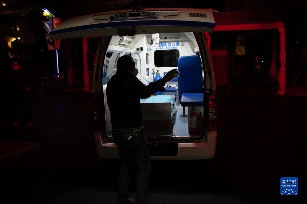1月12日,在復旦大學(xué)附屬華山醫院虹橋院區急診大廳外,一輛轉運車(chē)工作人員做完消殺處置后準備離開(kāi)。