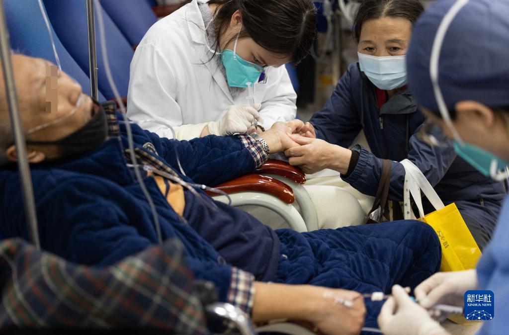 1月12日,在復旦大學(xué)附屬華山醫院虹橋院區急診輸液室,醫護人員在救治患者。