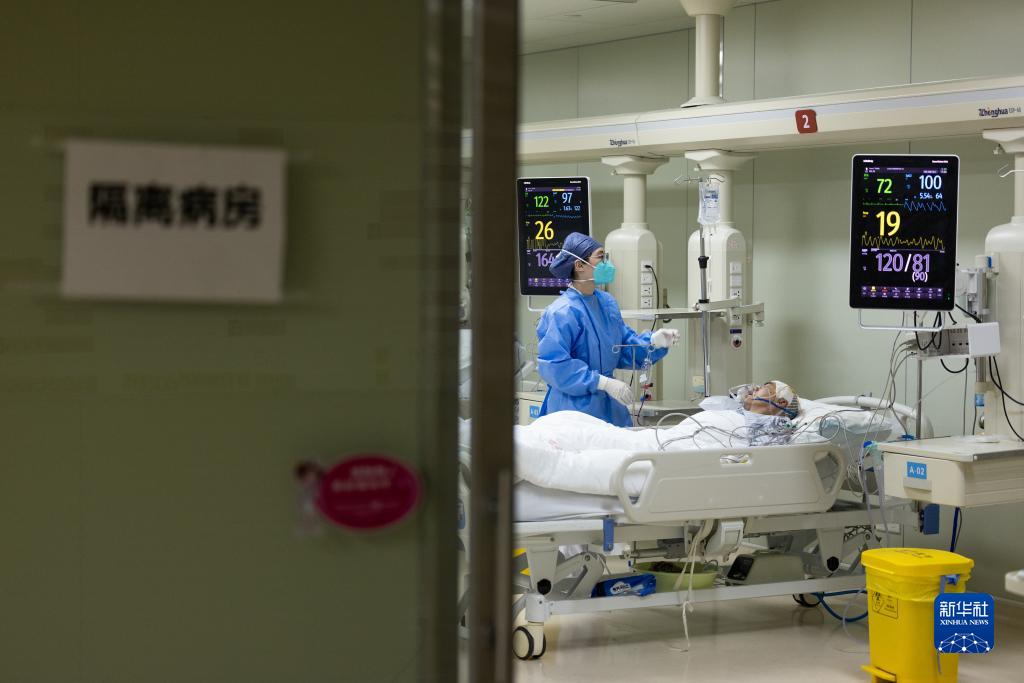 1月12日,在復旦大學(xué)附屬華山醫院虹橋院區收治肺炎患者的重癥監護室,護士查看患者輸液情況。