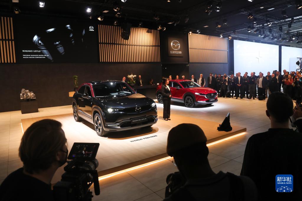 1月13日,在比利時(shí)布魯塞爾舉辦的第100屆布魯塞爾車(chē)展媒體預展上,人們參加馬自達MX-30 R-EV汽車(chē)(左)全球首發(fā)儀式。