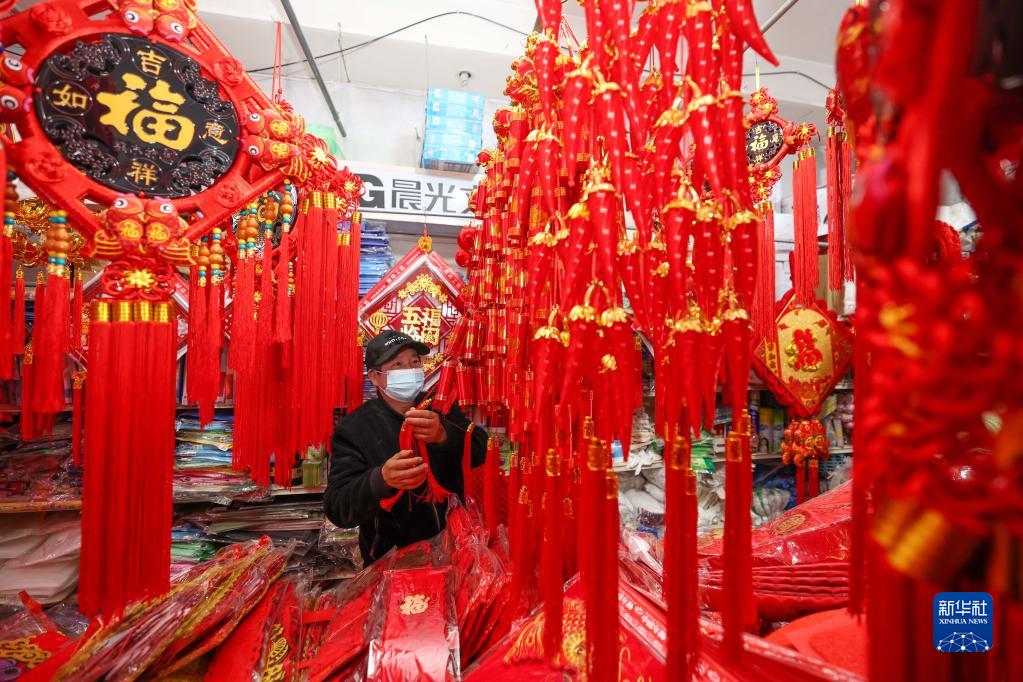 春節臨近,人們紛紛開(kāi)始置辦年貨迎接節日的到來(lái),年貨市場(chǎng)內一派紅紅火火的喜人景象。新華社發(fā)(韓賢普 攝)