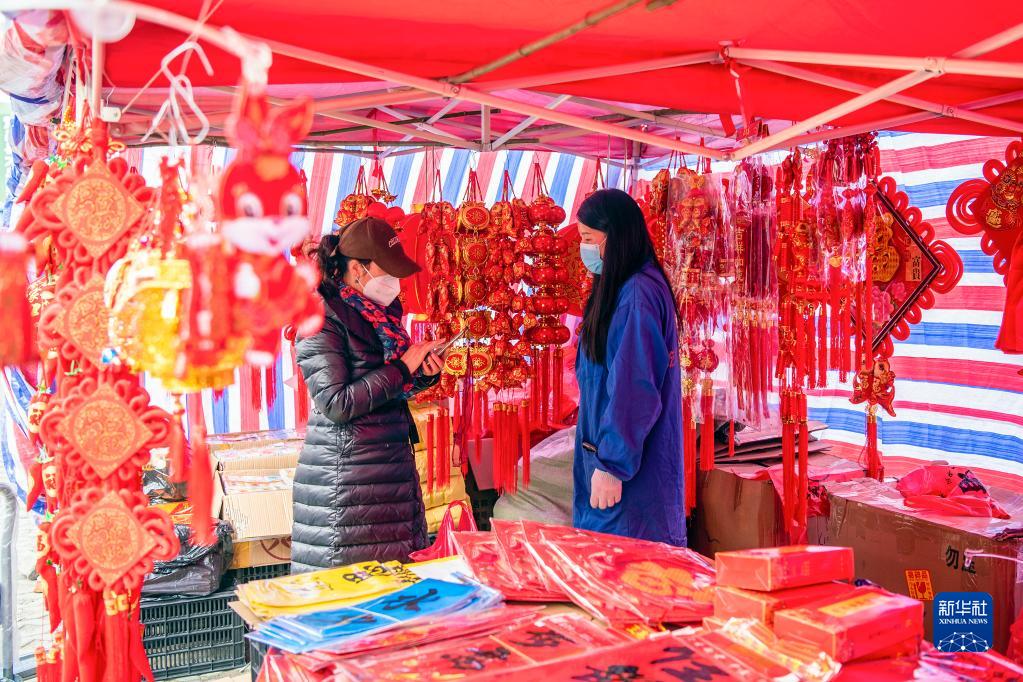 1月12日,在安徽省蕪湖市繁昌區繁陽(yáng)鎮城北農貿市場(chǎng),市民選購年貨飾品。