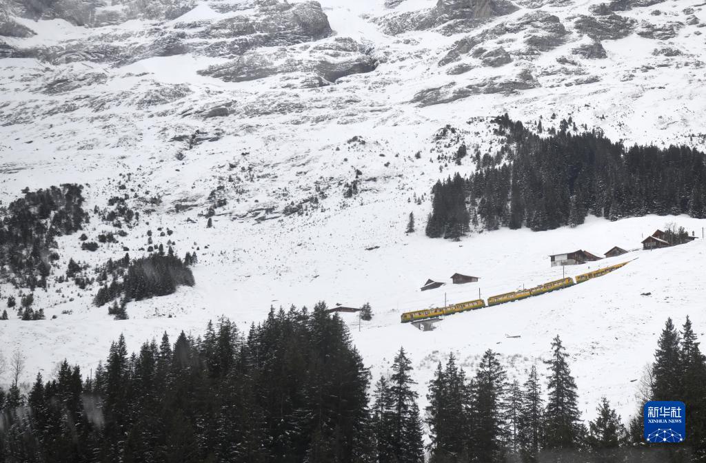 1月12日,一輛運送游客的列車(chē)在瑞士少女峰地區的山間行駛。