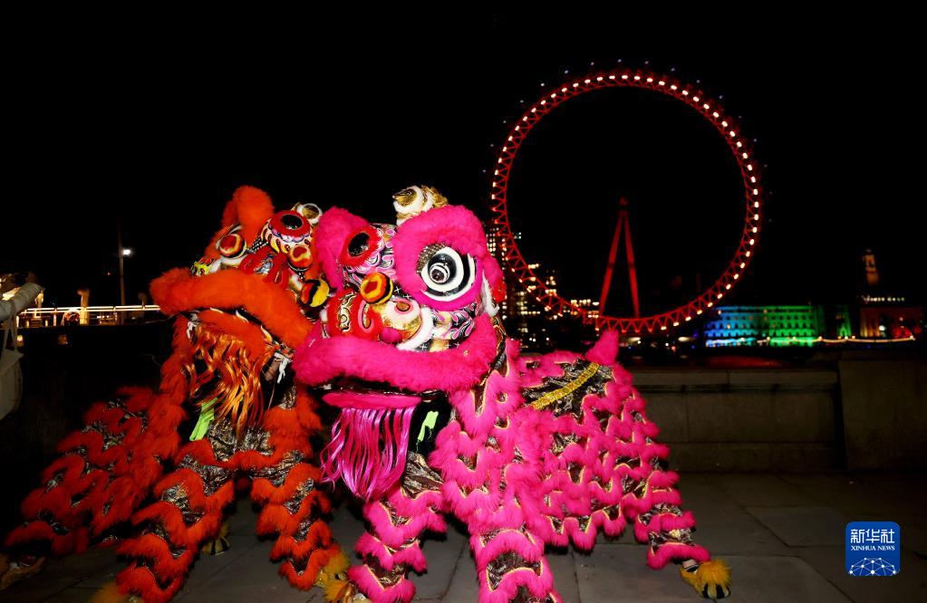1月13日,在英國倫敦,演員在亮起紅色燈光的“倫敦眼”前表演舞獅。
