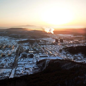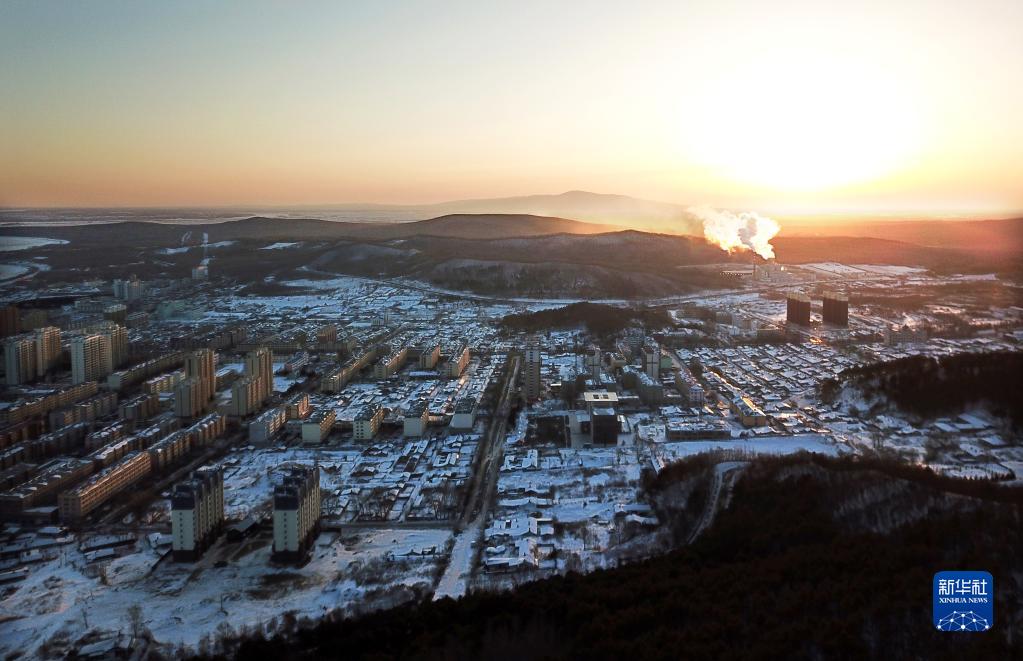 1月14日,晨光照耀著(zhù)黑龍江省撫遠市城區(無(wú)人機照片)。