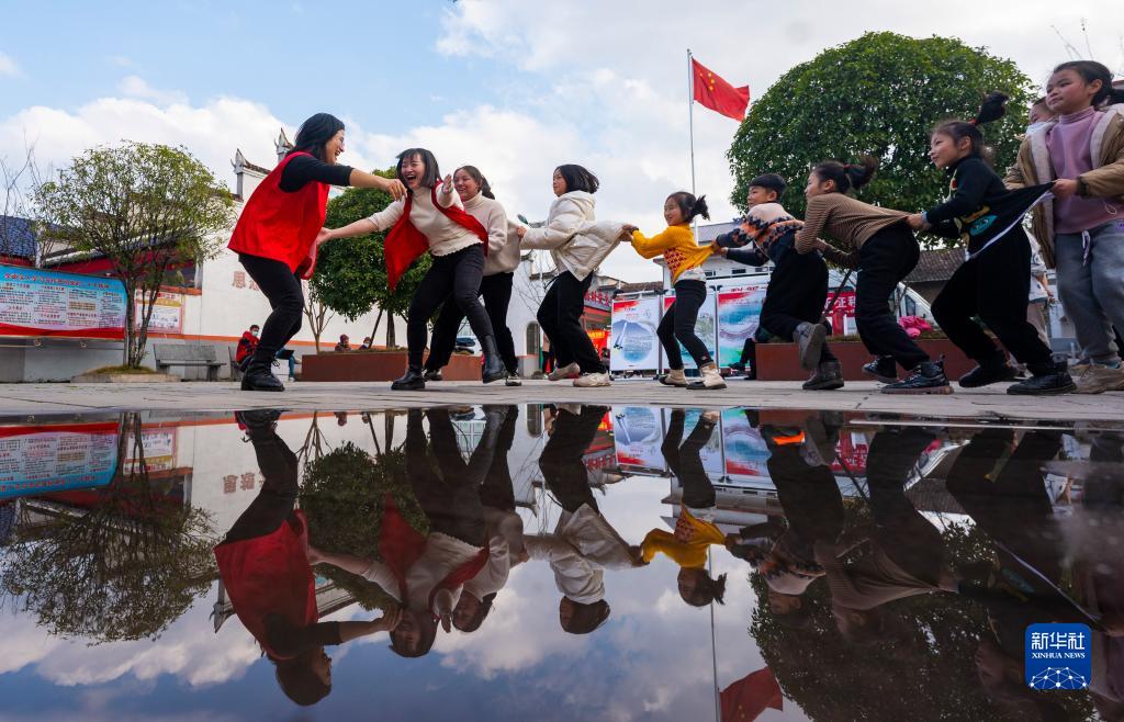 1月13日,江西省新余市渝水區珠珊鎮花田村畫(huà)溪書(shū)院,孩子們在志愿者組織下參與趣味游戲。