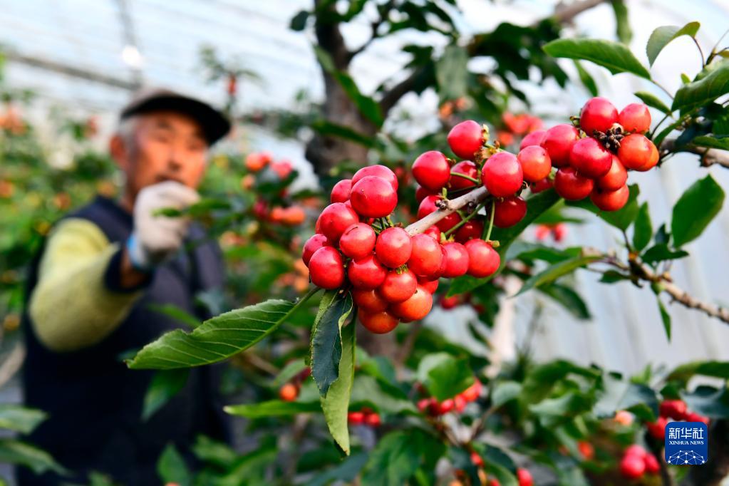 1月14日,在五蓮縣戶(hù)部鄉果樹(shù)大本營(yíng),工作人員在管護設施大棚里的櫻桃。