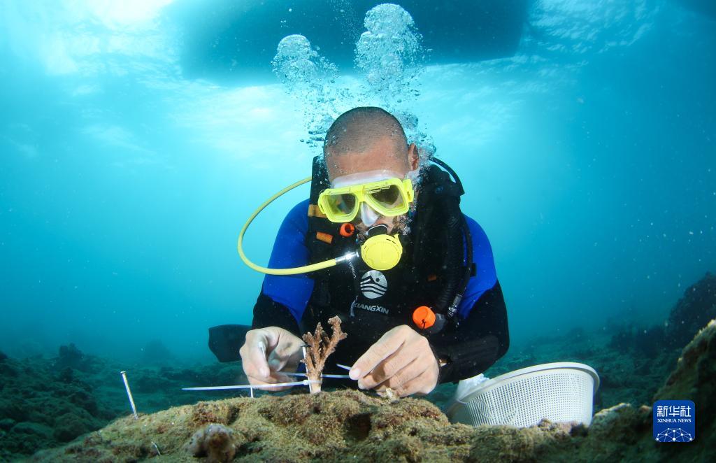 在海南省三亞市亞龍灣相關(guān)海域,潛水員在海底移植珊瑚(2022年11月17日攝)。