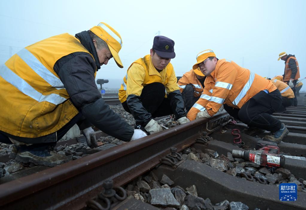 1月13日,中國鐵路上海局集團有限公司合肥工務(wù)段工作人員在合肥東站進(jìn)行軌道維修作業(yè)。