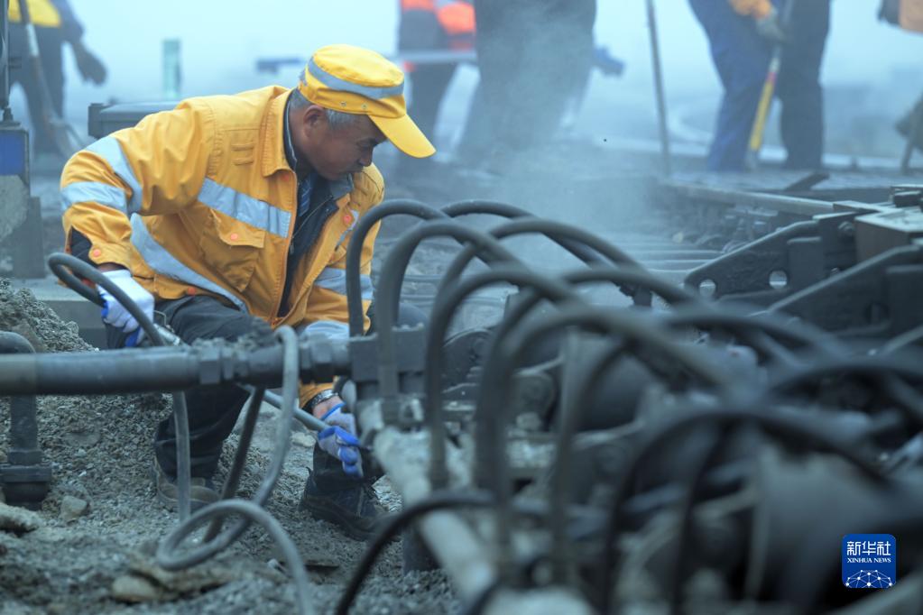 1月13日,中國鐵路上海局集團有限公司合肥工務(wù)段工作人員在合肥東站進(jìn)行駝峰減速器整修作業(yè)。