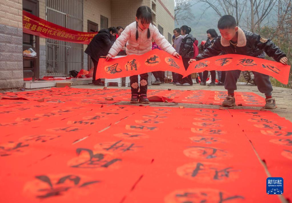 1月14日,湖南省永州市道縣橫嶺瑤族鄉菖路村,小朋友在晾春聯(lián)。