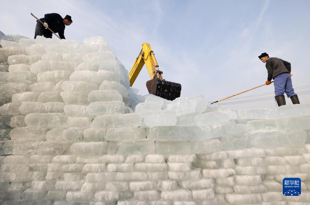 1月14日,河北省唐山市豐南區黑沿子鎮的農民在整理碼放采集的冰塊。