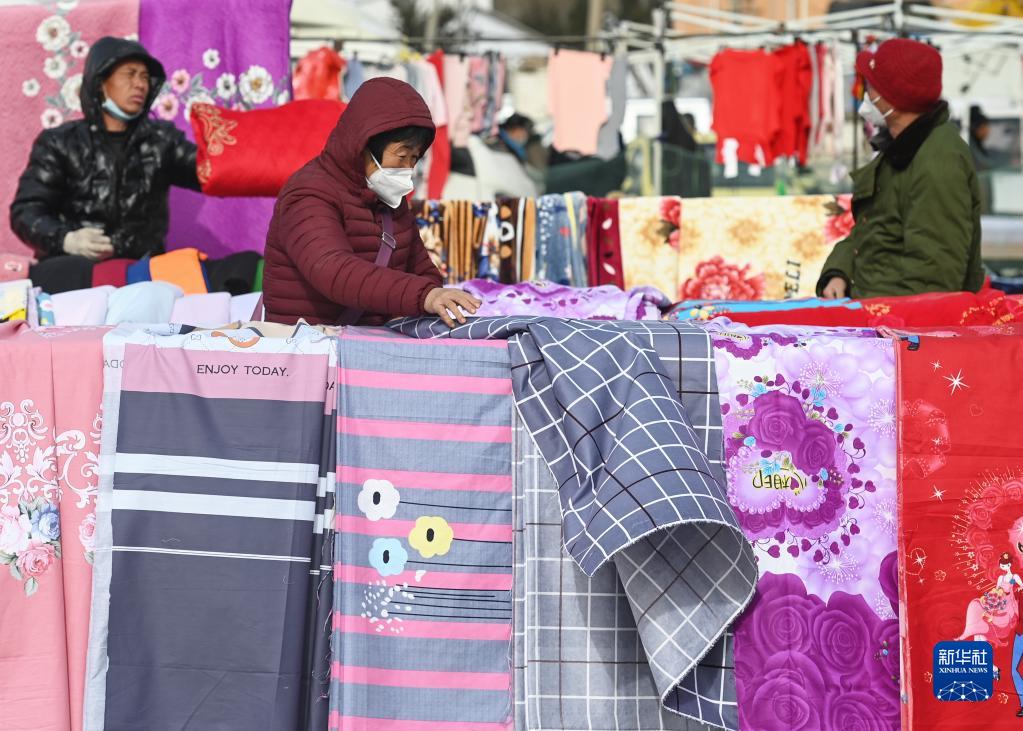 1月14日,顧客在一攤位前選購布料。