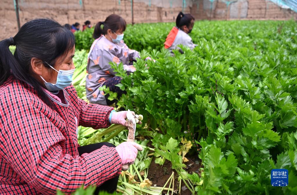1月13日,工人在西安市高陵區何村的蔬菜大棚里整理采收的芹菜。