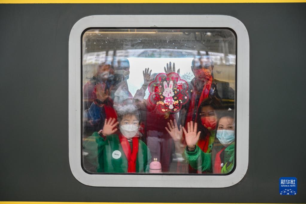 1月13日,在福州火車(chē)站,務(wù)工人員及家屬隔著(zhù)車(chē)窗向火車(chē)站服務(wù)人員揮手致謝。